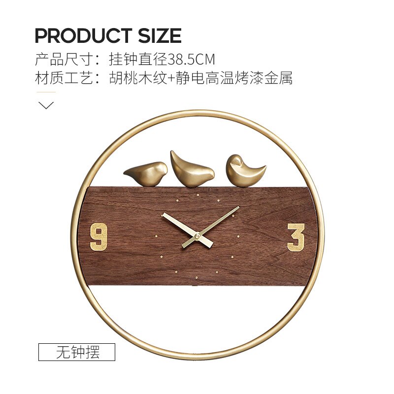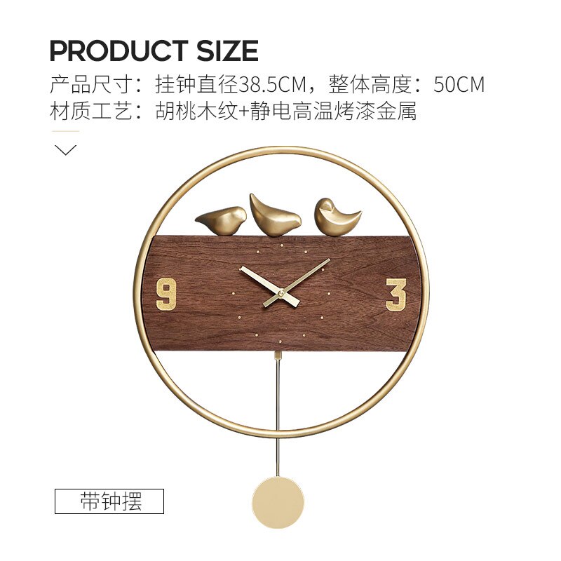 Tyto hodiny představují mistrovské dílo, kde se snoubí přírodní krása masivního dřeva s leskem zlatých akcentů. Centrální deska z kvalitního dřeva poskytuje teplý a uklidňující základ, zatímco leštěný zlatý kruhový rám a ručičky dodávají punc opravdového luxusu. Ale to, co tyto hodiny činí skutečně výjimečnými, jsou tři decentní zlaté figurky ptáčků, které elegantně sedí na horní části dřevěného ciferníku. Přinášejí do designu hravý a zároveň rafinovaný prvek, který vypráví příběh o klidu a přírodě. Kyvadlo se pohybuje tiše a plynule, což podtrhuje klid a harmonii, kterou hodiny do vašeho interiéru vnesou, aniž by rušily ticho vašeho domova. Hodí se skvěle do moderních, minimalistických i klasicky zařízených prostor.