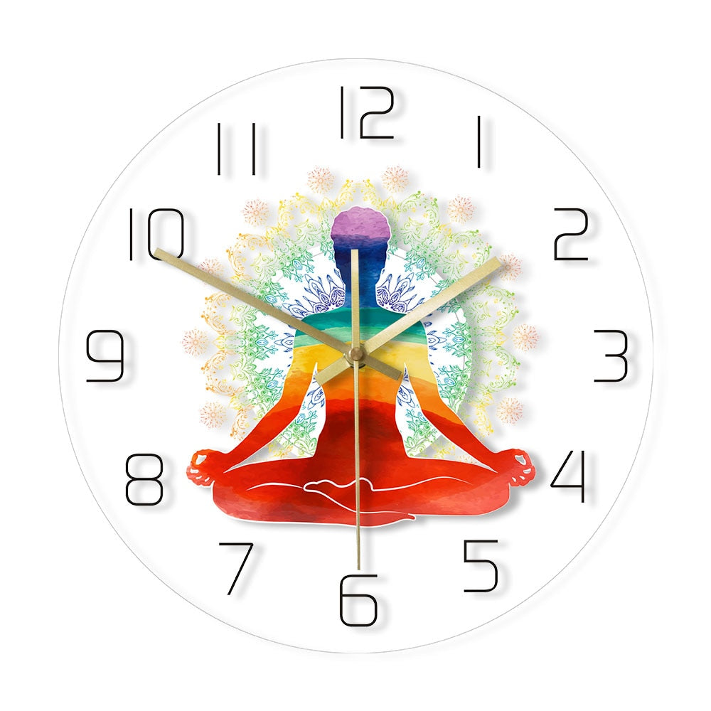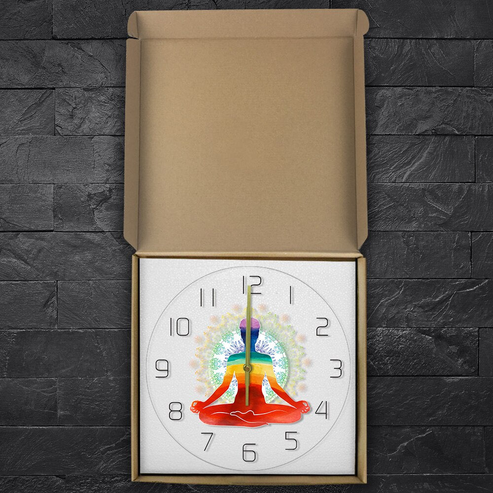 Představujeme vám naše jedinečné nástěnné hodiny s motivem jógy, které jsou víc než jen ukazatelem času. Jsou ztělesněním klidu, meditace a vnitřní rovnováhy, které do vašeho interiéru vnesou pozitivní energii a harmonickou atmosféru. S designem meditující postavy v lotosovém sedu, zářící v barvách čaker a obklopené jemnou mandalou, tyto hodiny nejenže ukazují čas, ale také připomínají důležitost mindfulness a osobního blaha. Ideální pro ty, kteří milují jógu, meditaci nebo prostě hledají originální a uklidňující doplněk do svého obývacího pokoje, ložnice či meditačního koutku.