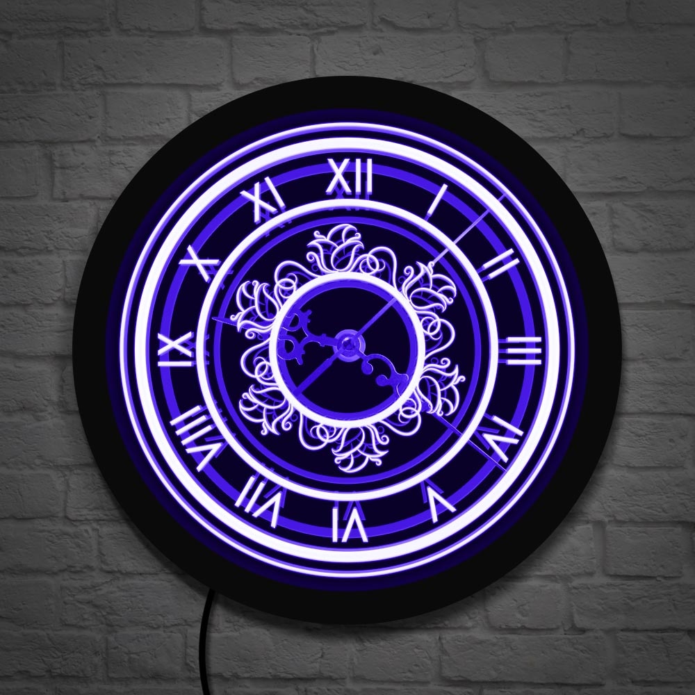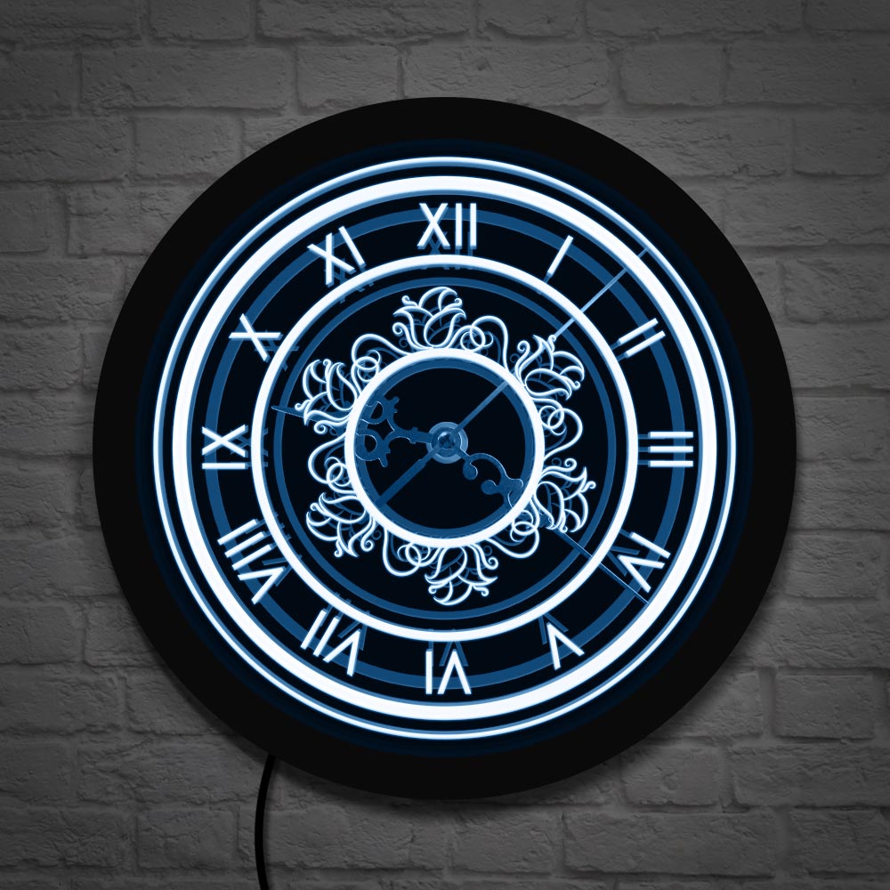 Naše retro nástěnné hodiny s LED osvětlením jsou pečlivě navrženy tak, aby splňovaly nejen estetické, ale i praktické požadavky moderního bydlení. Robustní černý rám elegantně kontrastuje s jasně zářícím modrofialovým LED podsvícením, které zvýrazňuje majestátní římské číslice a složité ornamenty uprostřed ciferníku. Každý detail, od filigránových hodinových ručiček až po precizní zpracování celého designu, je promyšlen tak, aby vytvořil dojem luxusu a nadčasovosti. Nechte se okouzlit hrou světla a stínu, která se rozprostře po vaší zdi, a vychutnejte si tiché a plynulé fungování hodin, které vás nebude rušit. Je to dokonalý doplněk pro ty, kteří oceňují spojení tradice s inovací a chtějí domovu dodat punc originality.